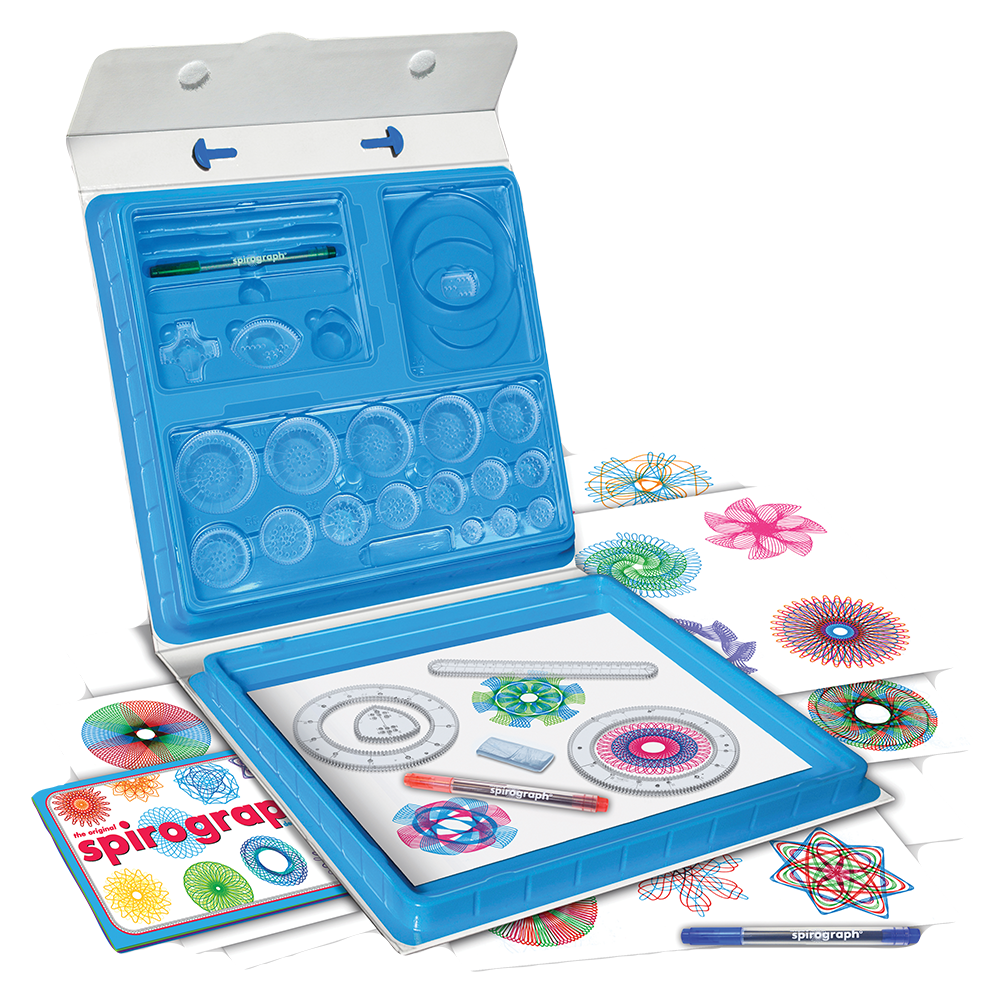 The classic way for aspiring artists to create millions of amazing designs is back and better than ever! The Original Spirograph Deluxe Set features all the iconic wheels and rings of the original, re-engineered and updated for today. The kit features a high quality, durable carrying case with snap-in storage and a built-in drawing surface. The precision engineered Spirograph gears work with the three design pens included in the set as well as with most standard pens, markers and pencils. Spirograph putty holds the Spirograph pieces securely on the paper so that you can create intricately beautiful designs with no holes in the paper! The set also comes with 20 sheets of design paper and a full-color design guide, which explains the fundamentals of drawing with Spirograph, as well as step-by-step instructions for creating your own designs!