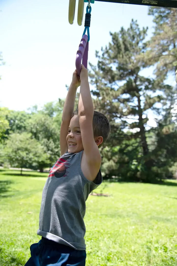 - Beautiful attractive Colorful 36’ Line, 8 Accessories: 2 Monkey Bars, 2 new Tree Holds, 2 Monkey Fists, 2 Gym Rings; Heavy-Duty Ratchet, Ratchet Cover; 8 Delta Carabiners & Line Clips, & Storage Bag.