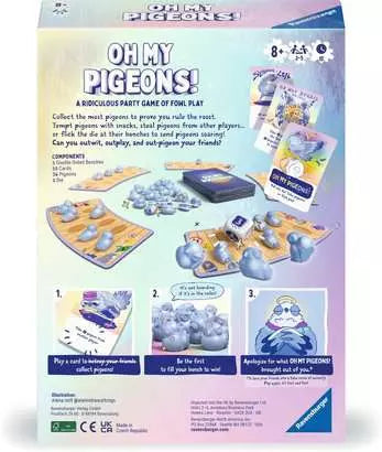 In this ridiculous party game of fowl play, be the first to fill your bench with pigeons. Play hilariously illustrated cards allow you to collect pigeons from the middle of the table or even steal them from your neighbors’ benches. When you roll the die, you might get to flick it at an opponent’s pigeons to knock them off their bench!