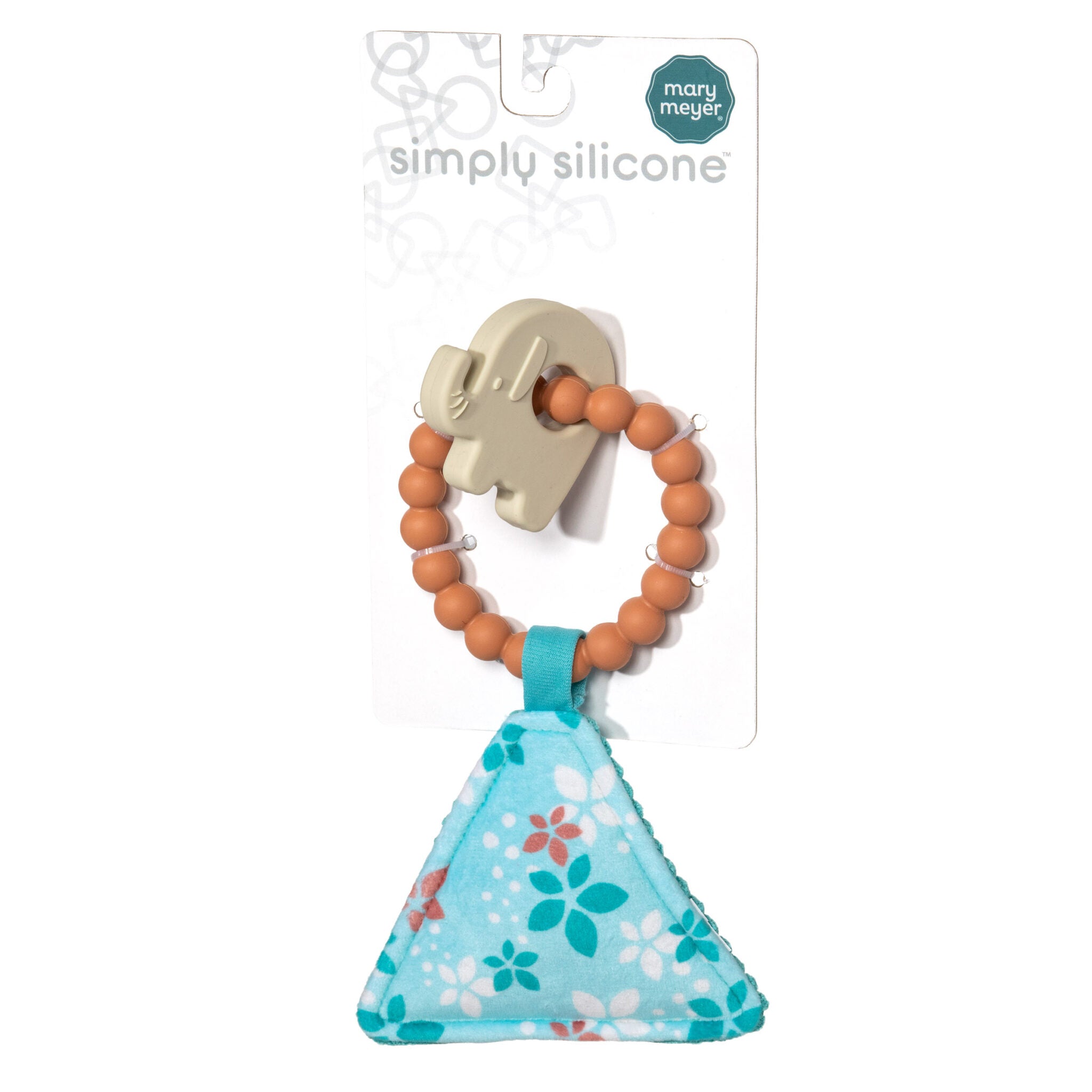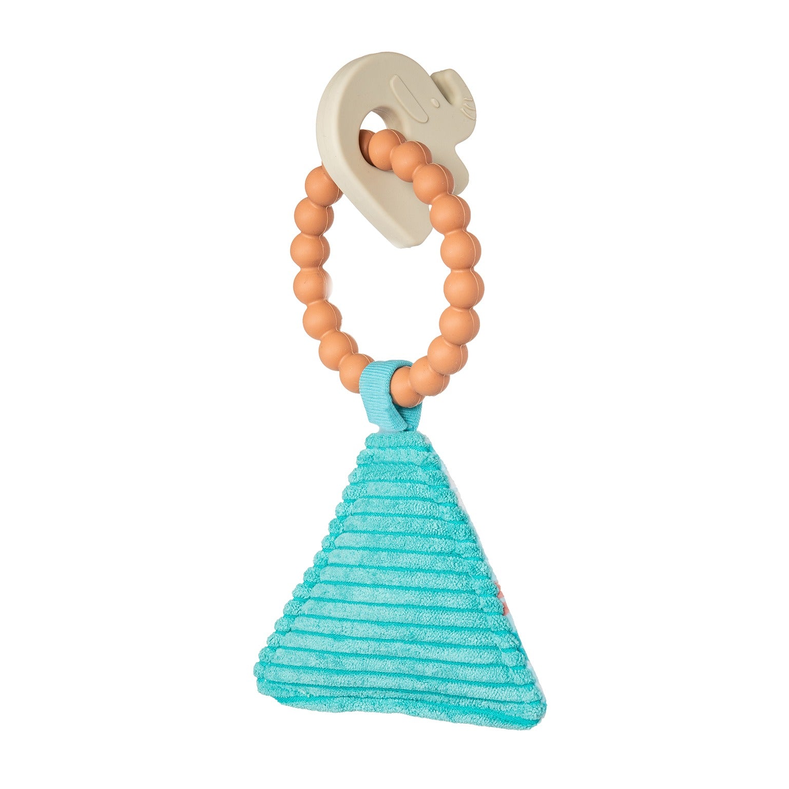 Food grade silicone rings. Fabric triangles with squeaker and corduroy on the other side. Packaged on a branded backer card.