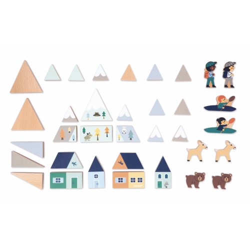Build the highest mountain you can! With this set of wooden blocks and figures, children from the age of 2 can build a village in the heart of a winter landscape. Comprising a total of 35 solid wood elements, this building set contains: 26 cubes to assemble the village and snow-capped mountains, and 8 characters and animals. There's so much to discover in this Valley! With their wooden blocks, children develop their creativity and imagination, as well as their dexterity. Little ones love to stack endlessly, while big kids invent their own worlds. Funny stories and crazy adventures will take place in this real postcard! All you have to do is follow the pattern to arrange everything like a jigsaw puzzle, and slide the transparent lid to admire the result. Guaranteed wow factor when you open the set! This Mountain Valley cubes and figures set is part of our Cross Roads collection: a series of playmats with circuits, even more fun when complemented by our assortments of cubes and small wooden vehicles. This set is particularly suited to the Mountain Valley playmat, but can also be combined with other mats in the range. It's made from wood from sustainably managed forests. So get your cleats on!