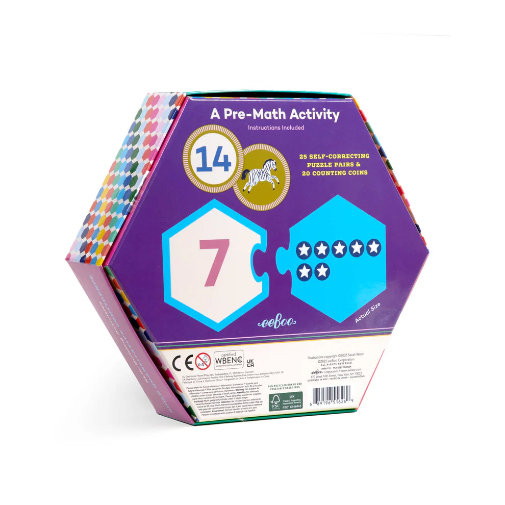 - 25 hexagonal, self-correcting number puzzle pairs | 20 sturdy counting coins with vibrant imagery